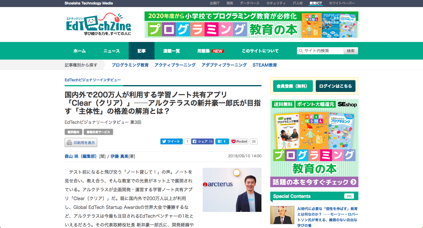 「国内外で200万人が利用する学習ノート共有アプリ「Clear(クリア)」――アルクテラスの新井豪一郎氏が目指す「主体性」の格差の解消とは?」(EdTechZineより)